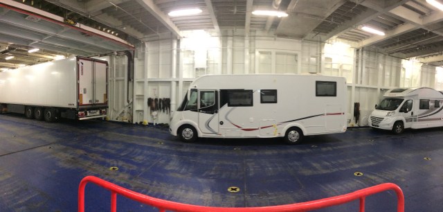 Denna gången har vädret varit med oss, visst gungar det men inte som sist. Jag fick fickparkera mellan en husbil och en lastbil och han som (jobbat med detta i 25 år) skulle hjälpa oss in, kan inte haft körkort. Först ville han att vi skulle köra in men gick sedan med på att vi backade in. Han bara skrek och vinkade och vi hade gjort jobbet så mycket bättre och fortare utan hans anvisningar…