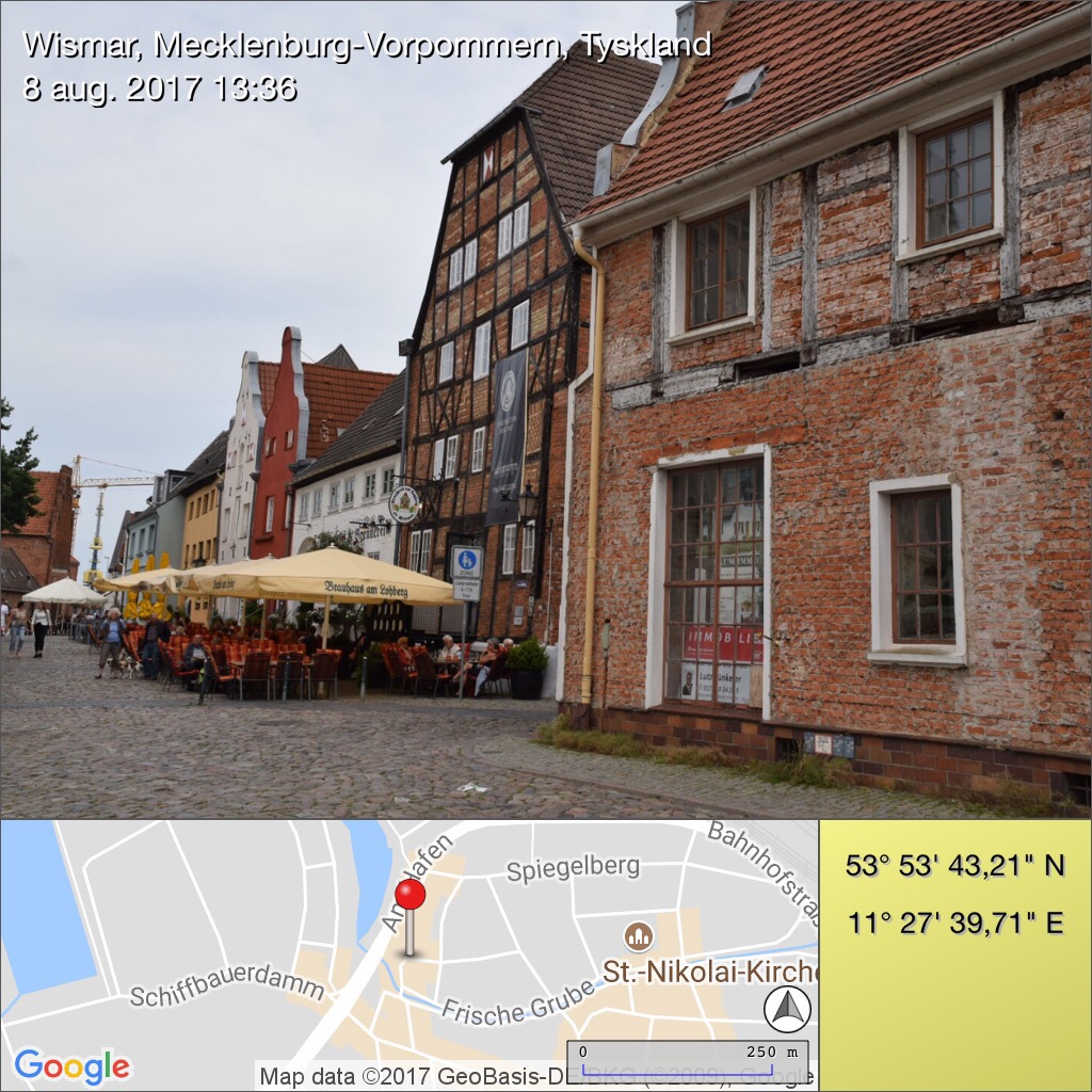 Min familj har varit i Wismar tidigare men då var det julmarknad och minusgrader, idag har vi haft runt 25c och full sol nästan hela dagen. Sist de var här så fick de en guidning genom staden och nu ville dem uppleva byggnaderna i lugn och ro. Wismar blev svenskt 1632 och förblev det till år 1803 då man tecknade ett pantbrev i Malmö med möjlig återinlösen på 100 respektive 200 år. 1903 beseglades Wismar återgång till Mecklenburg. Man eldar fortvarande med kol i bostäderna 😳 på torget finns Den gamle svensken – alter schwede, som idag är restaurang (bruna huset längst ned till höger)
