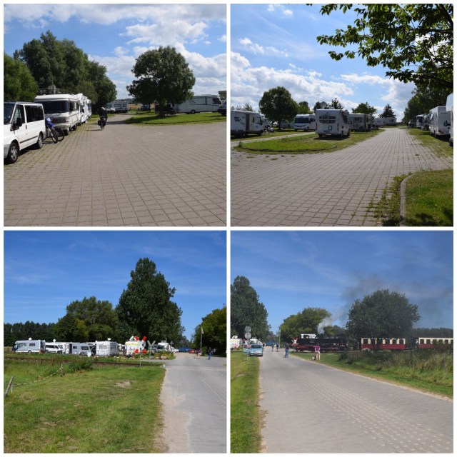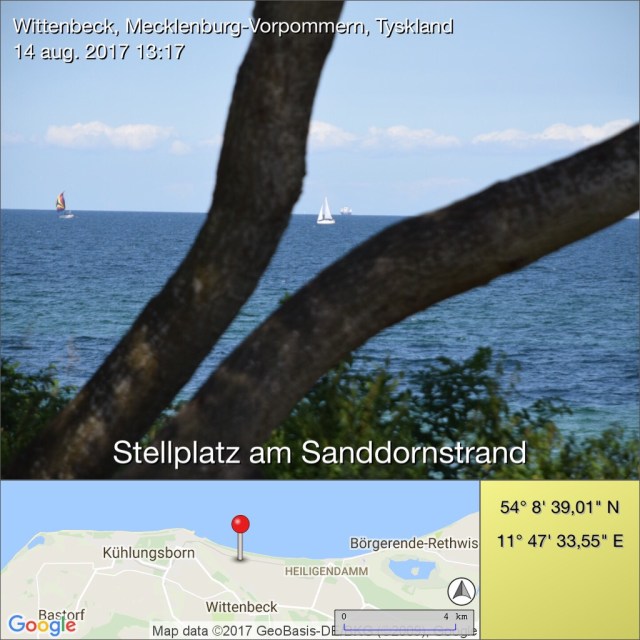 Det är inte varmt denna sommar! Mina ägare gick med jackorna på i solskenet igår och inatt hade vi 11C 😳 !!!! Blåsten är hård och kall, så vi beslöt att lämna Rügen för denna gång och åka till Tyska rivieran… Denna skall man då hitta mellan Rostock och Wismar. Så det fick bli orterna Kühlungsborn och Heiligendamm för vår del. En stor ställplats skulle finnas vid Sanddornstrand i Wittenbeck. Den hittade vi och jag parkerades tillsammans med Dethleffsen.
