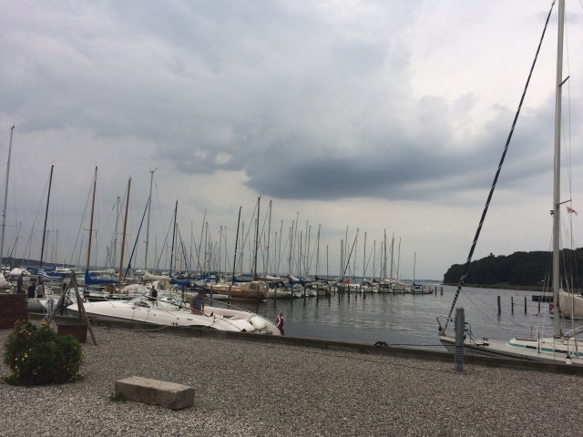 Nu står vi här och lyssnar på regnet…redan i Danmark.