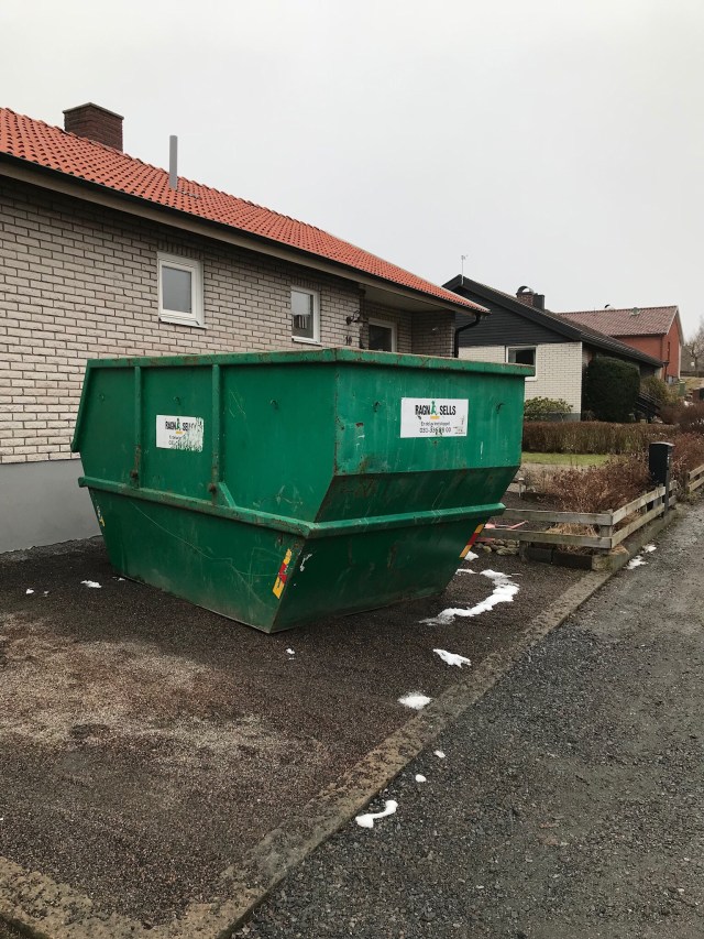 Där mina bilkompisar skall vara står nu en grön container! 😳? Kvällen kom och det ser fortfarande likadant ut… en bil kom hem och klämde sig mellan mig och den där gröna mojängen…