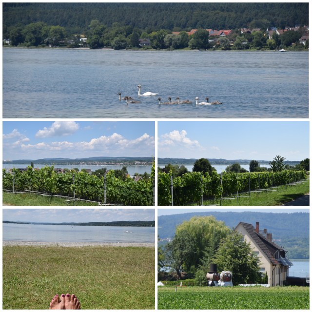 Strax därefter var det cykeltur på schemat för mina ägare. Denna gång gick turen in i Schweiz och ut på landsbygden, upp och ned för backarna. Men aldrig så jobbiga backar att de inte orkade enligt vad hon återberättade, men cykeln hade inte fått sin vårkur av oljor, så hennes lät som en gammal skrothög och växlarna krånglade och tramporna var tröga…det var vackra omgivningar som de cyklade igenom, men värmen, solen och badlusten fick dem att korta av dagens tur till 38 km……från där de cyklade kunde de se till andra sidan sjön där vi varit för någon dag sedan.