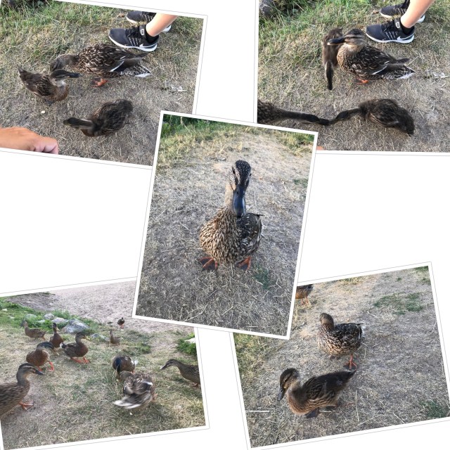 Nere på stranden vid badet lekte barnen med änderna, som var så närgångna att de nästan gick på ens fötter. De åt i alla fall ur händerna på barnen och hoppade nästan upp i knät när man satte sig på huk. Min ägarinna verkade inte vara farlig alls, mobilen var mer något änderna ville åt, det kunde ju vara så att även den gick att äta.