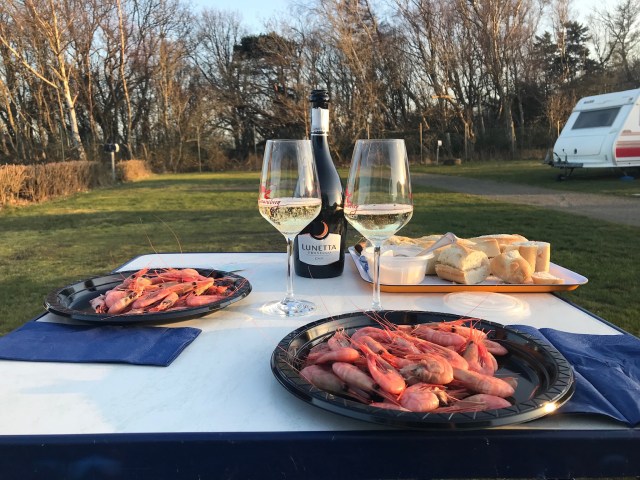 Vilken underbar bild med räkorna och vinet i solen! 🙂