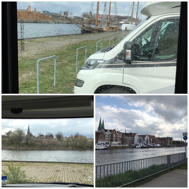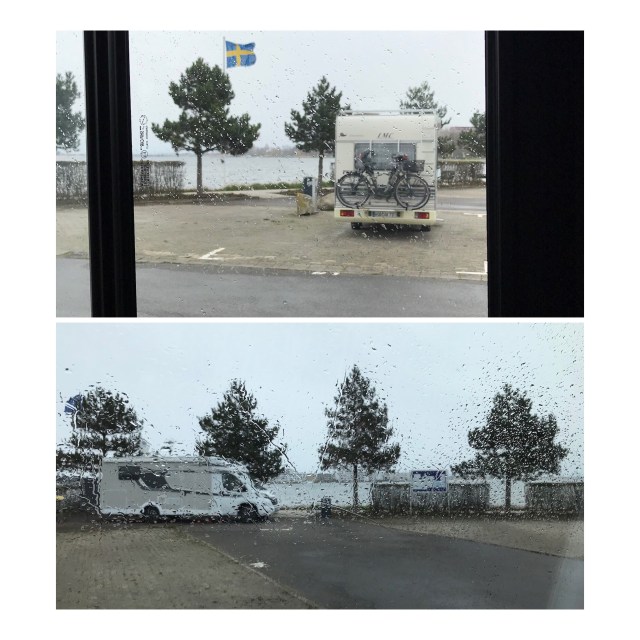 Utsikten i morse från ställplatsen i Heiligenhafen var inte så mycket mer tröstande…och inte på färden söderut idag heller. Fullt med snö längst vägen och helt plötsligt blev det helt grönt. 😳 Men fortvarande 2-4 c 😔