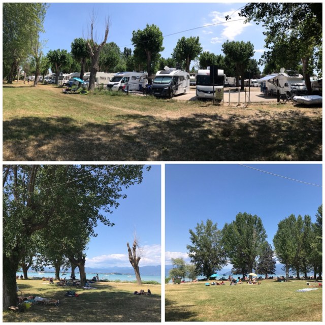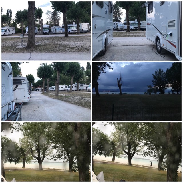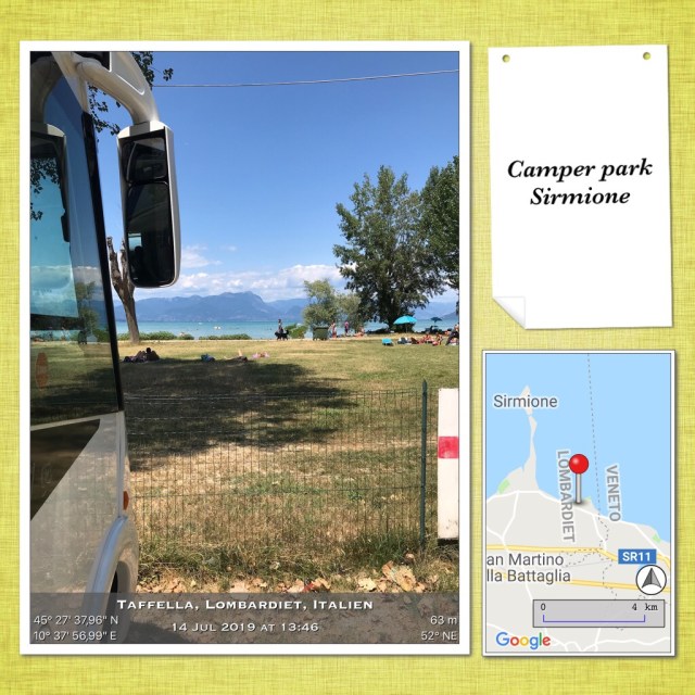 Vi kom till Sirmione Camper park runt lunchtid eftersom mina ägare ville ta ut det mesta från agricampeggion i Bardolino. 😊 Att vi hade bokat och betalat, det fanns det ingen anteckning om hos den gamle farbrorn i ‘receptionskuren’… Inte fullt förstod vi, bara kör och ta en plats. Min ägare letade febrilt efter kvittot från banken och mailet till dem. Han bara viftade iväg oss för att leta plats…