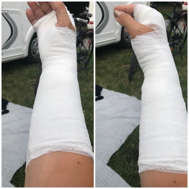 Tur i oturen fanns ett sjukvårdstält på platsen och hon kunde sätta sig där. Plocka fram tabletterna från väskan blanda i vatten. Cortisonsalva på och kylkudde i en timme. Därefter blev vi skickade till akutstationen 1,5 km bort. Läs deras tankar då…vilken tid i natt skulle de komma tillbaka till mig 😔. Men det svåraste var nog efteråt att hitta en stor taxi som kunde köra hem mina ägare och deras cyklar till mig 😬. Nu blir det bara sitta stilla och vila i ett par dagar då…😬