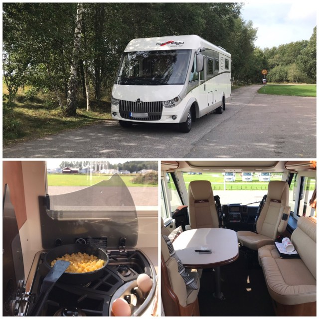 Jag styrdes till Varberg, men där var helt fullt överallt! Vinfestival och cykellopp…bara att vända kosan någon annanstans. First camp Kärradal hade plats, så det fick bli min första viloplats. Jag fotograferades till bloggen och allt hos mig testades. Matlagning på spisen, kyl mm först på gasol (luktar inget gott när något nytt skall trimmas in med värme – typ bränt plast) 🤢 och sedan på el. Dessutom var det en så där 28 c 🥵 så det blev varmt inne. Ugnen skulle köras in med 30 minuters inbränning. Sedan fick det bli matlagning i den varma ugnen.