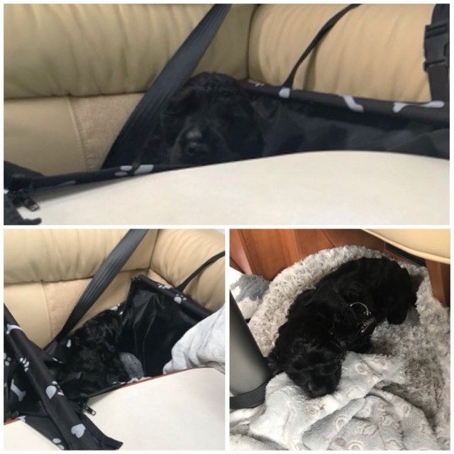 Min valp hade sin egna plats i ett tryggt litet hörn i min soffa. Min ägare startade mina motorer…valpen…somnade inte utan gnällde efter matte 😥 Vi kör sa hon, han brukar somna och till slut gjorde han det lagom till motorvägen 🙄 Sen satt han där och glodde över bordet tills han var på väg upp på bordet, skrikandes som en gris 😅😂 STANNA! Och det gjorde jag, valpen bytte plats och vi rullade vidare 😅