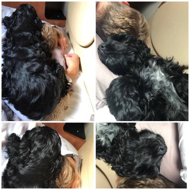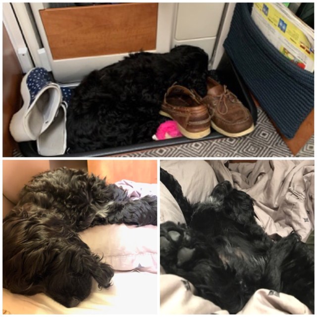 Om han var trött efter detta äventyr så kan jag lova att det var även ägarna som bestämde sig att ta en paus när valpen sov. Underbart att ta en kort tupplur…tills valpen vaknade och letade upp dem i sängen och fortsatte sin tupplur på ett liiiite udda sätt, men inte udda för honom för så väcker han min ägarinna varje morgon när det är dags att gå upp på morgonen för att fixa mat till honom…