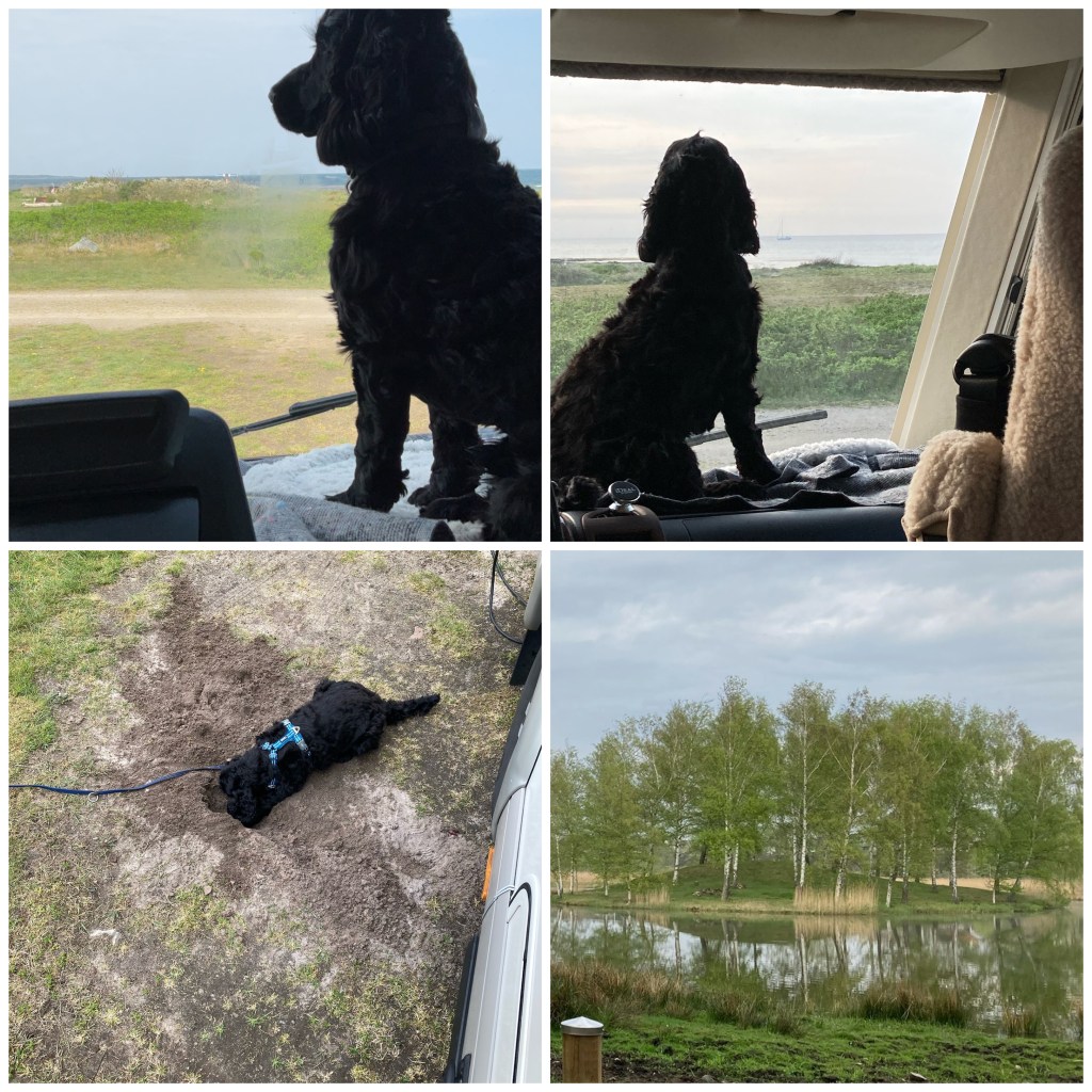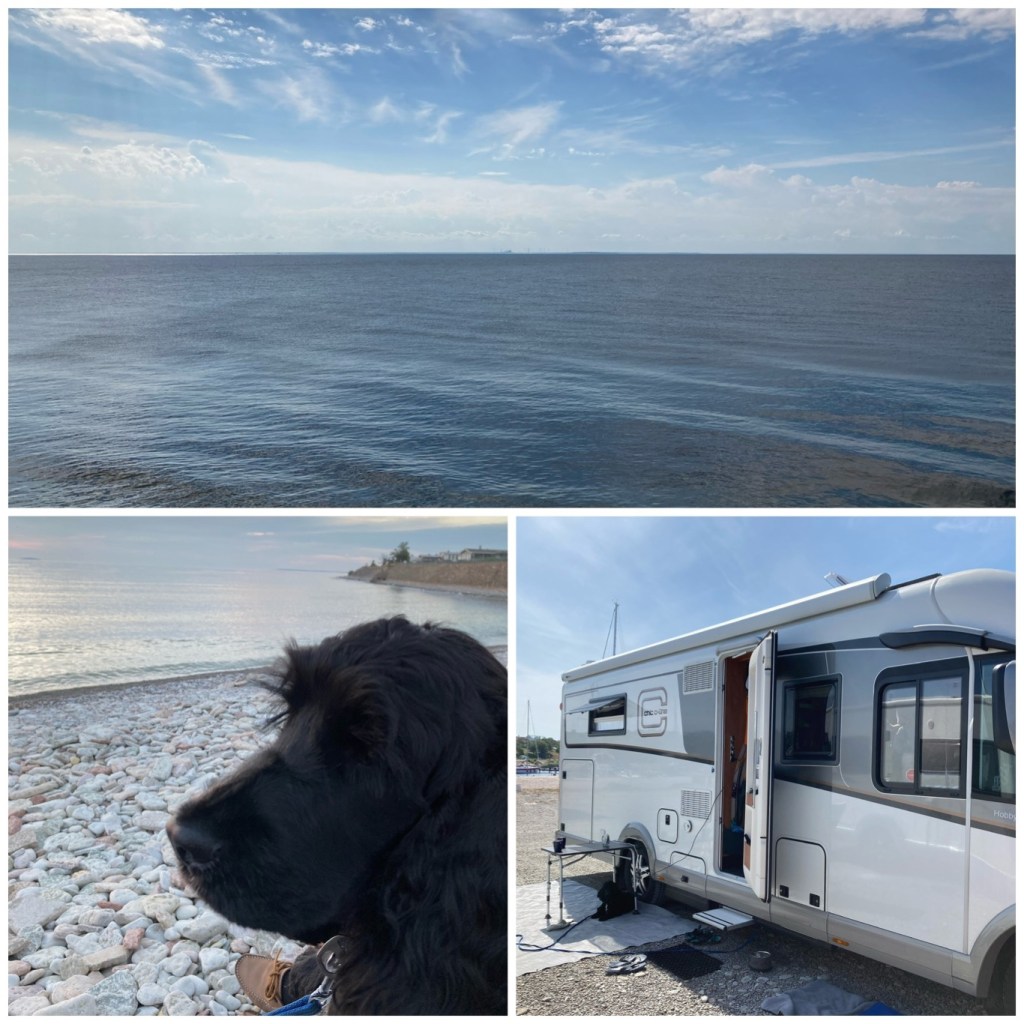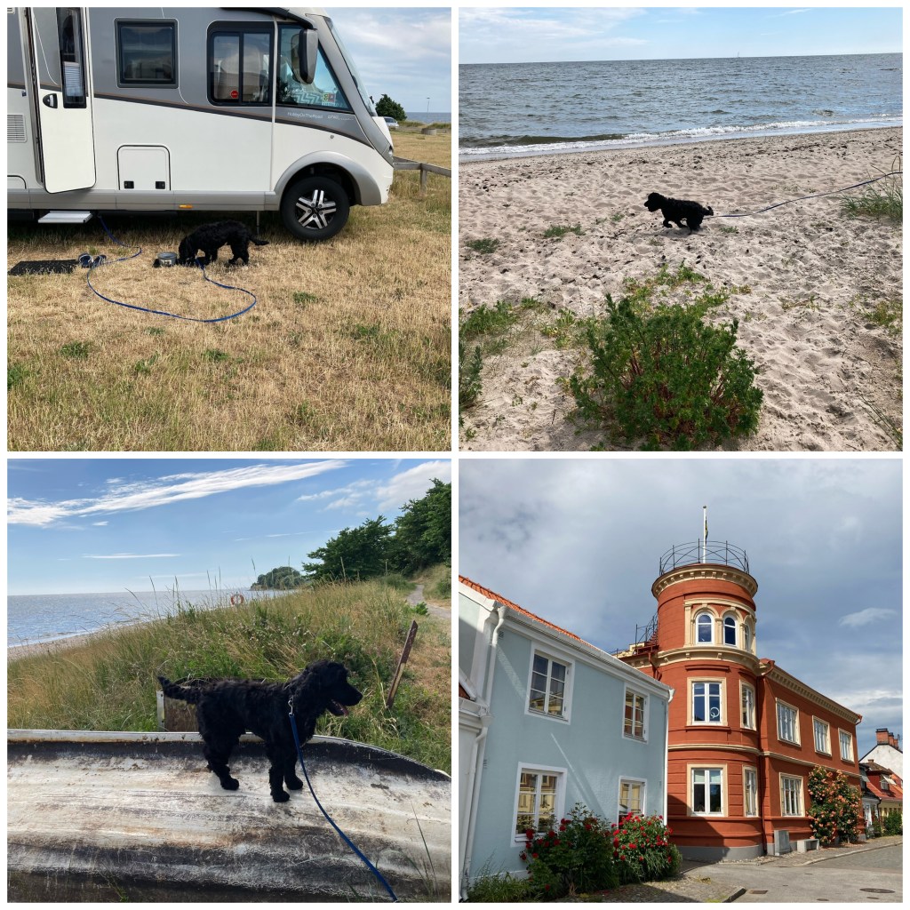Hundarna var inte välkomna någonstans på hela stranden så de fick ta bilarna till andra stranden 15 min bort för bad. Men där var nästan finare! Det blir nog inte First camp i Åhus nån mer gång utan privat stuga med plats för husbilen på tomten.